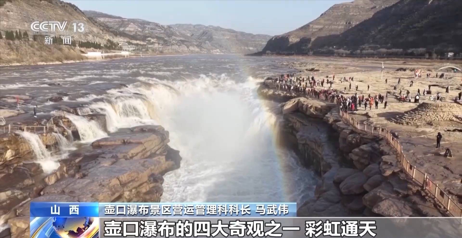 壶口瀑布景区营运管理科科长 马武伟:壶口瀑布的最佳观赏时期是晴天的上午9点到11点,这个时候,可以看到壶口瀑布的四大奇观之一——彩虹通天。因为壶口瀑布巨大的落差,溅起的水雾在阳光的漫射下,形成了一道美丽的七色彩虹。